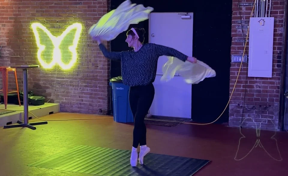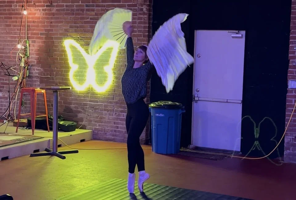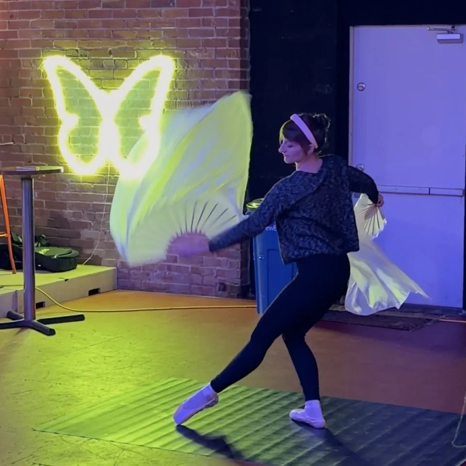 Acrobatics, posing, dance, flow arts, silk fans, Russian grip fans, small space, improvisation